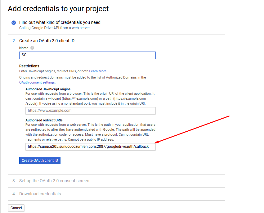 - Yetkili yönlendirme URI'ları metin kutusuna girin https://sunucu205.trdeserver.com:2087/googledriveauth/callback bağlantısını kendinize göre düzenleyerek kaydediniz.
